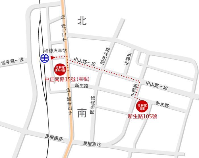 瑞穗火車站 (東站)下車,步行中山路一段,右轉中興路,左轉新生105號,僅500公尺,步行6分鐘,計程車3分鐘。
